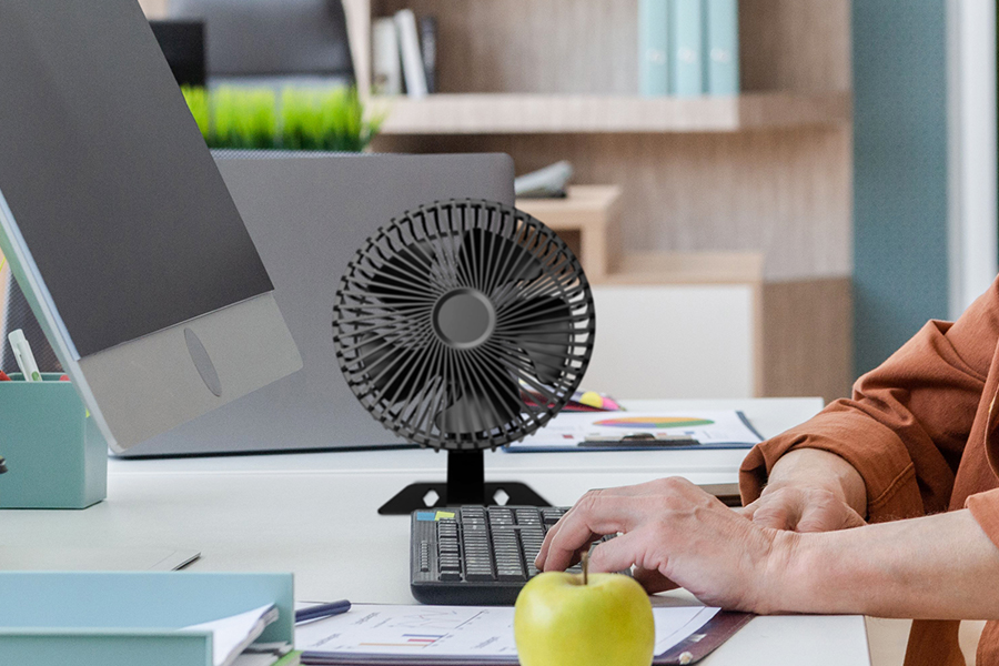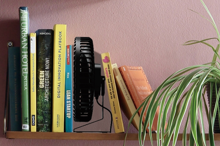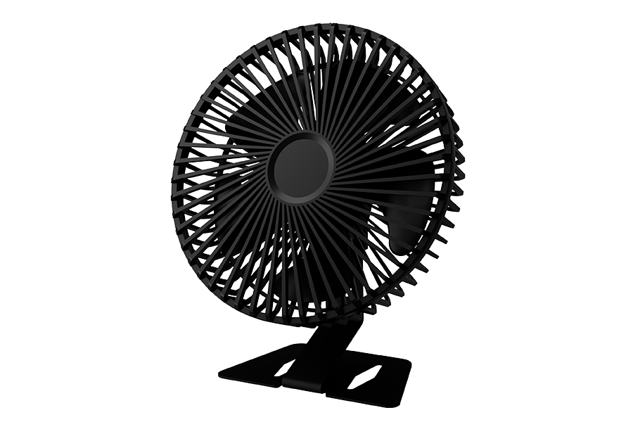 デスク周りに映えるシンプルデザイン、横~真上までの90度の手動首振り
