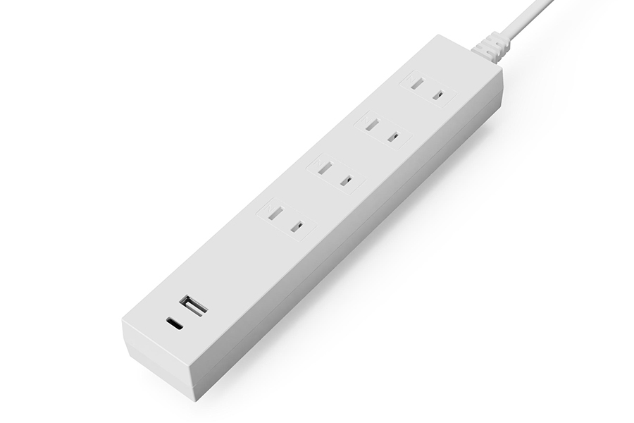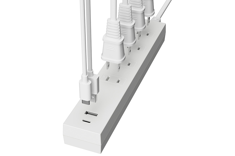 4つのコンセント差込口と20WPD(Power Delivery)出力可能なUSB Type-Cと5V2.4A出力可能なUSBAがついたケーブルタップです。コンセント差込口にはホコリの侵入を防ぐ安全扉を搭載しています。ACプラグにはトラッキング防止機能が付いています。雷サージから機器を守る雷ガードを搭載しています。