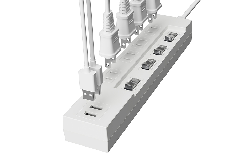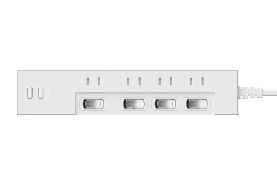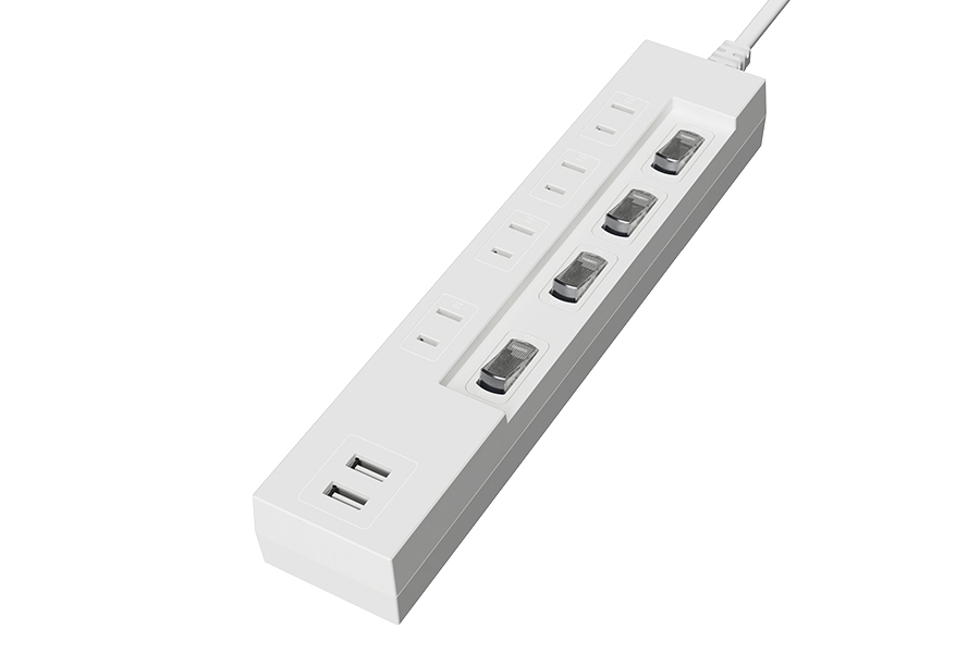 4つのコンセント差込口と5V2.4A出力可能なUSBがついた節電スイッチ付のケーブルタップです。コンセント差込口にはホコリの侵入を防ぐ安全扉を搭載しています。ACプラグにはトラッキング防止機能が付いています。雷サージから機器を守る雷ガードを搭載しています。