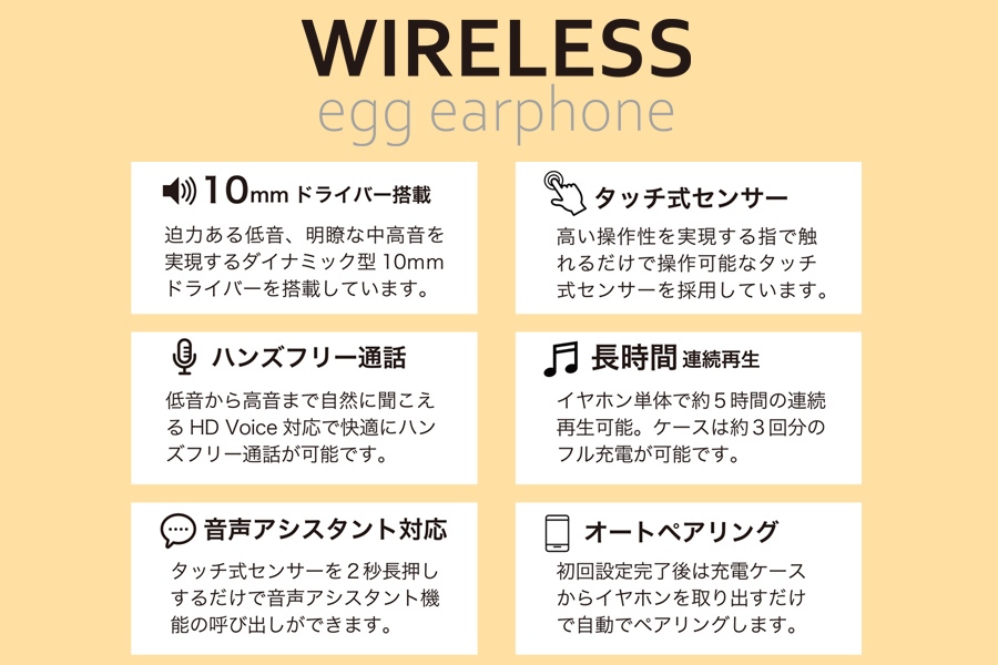 Bluetooth5.4+EDR搭載の完全独立ワイヤレスイヤホンです。たまご型の充電ケースと高音質イヤホンのセットとなっております。イヤホンには10mmダイナミックドライバーを搭載し切れの良い迫力のある低音と透明感のある中・高温を実現しています。ハンズフリー通話に対応しており音声アシスタントの使用も可能です。自動で再接続が可能なオートペアリング機能に対応しています。